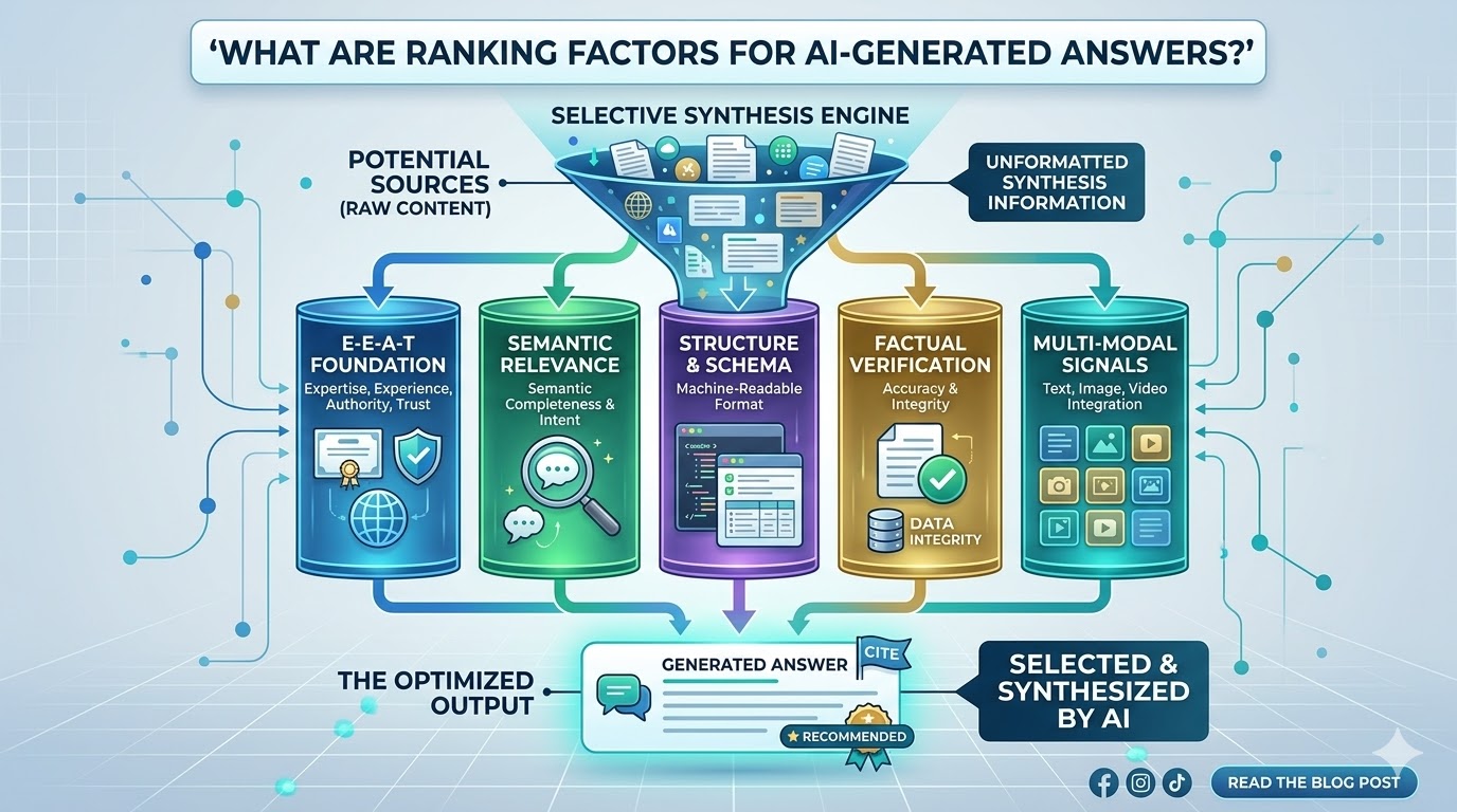 The confirmed ranking factors for AI generated answers, in approximate order of measured impact, are: